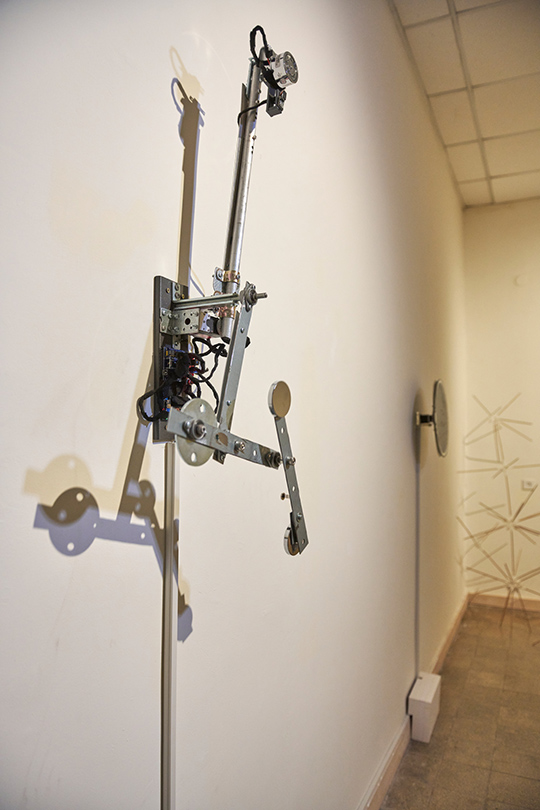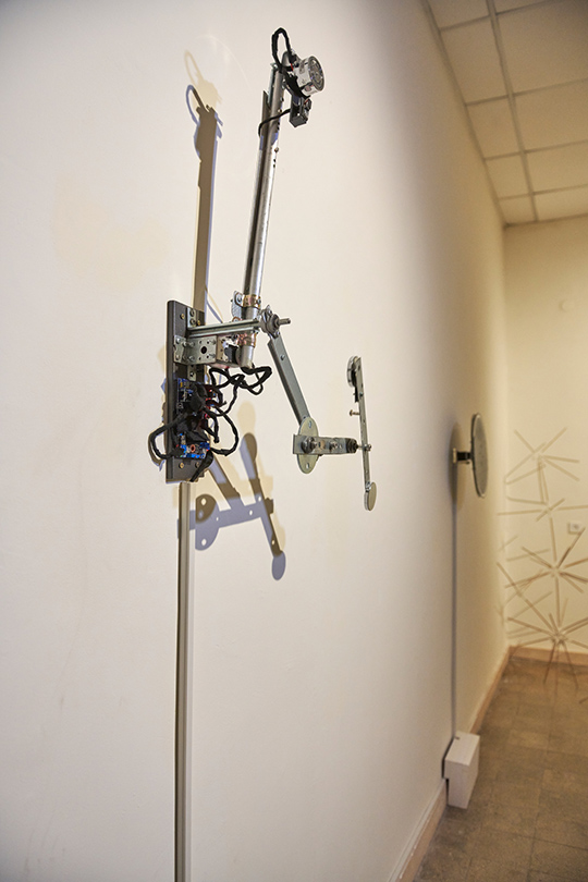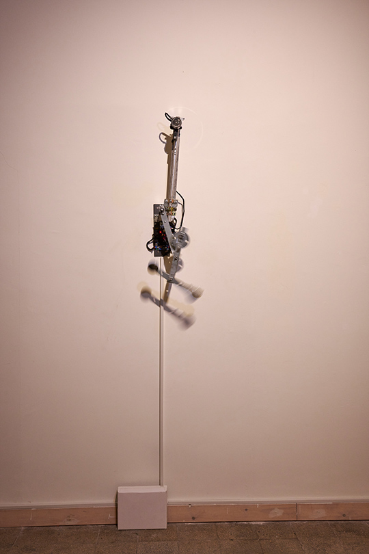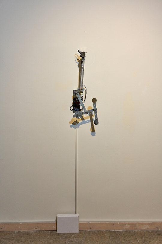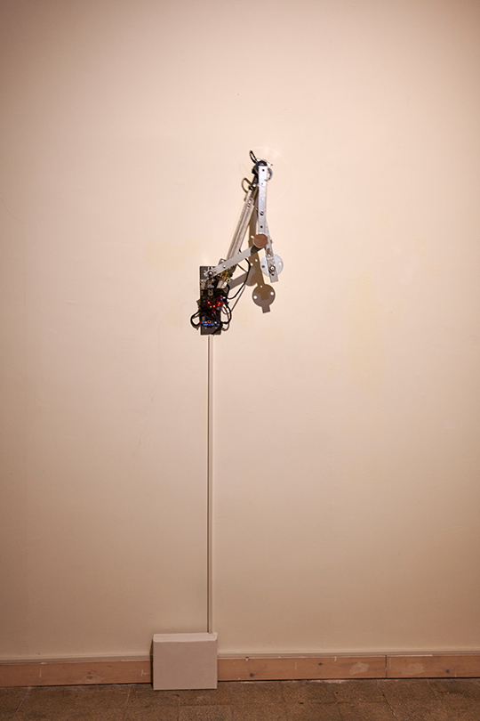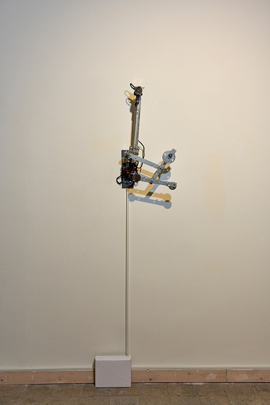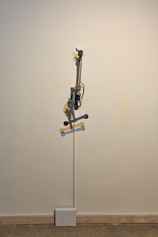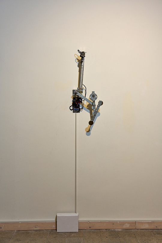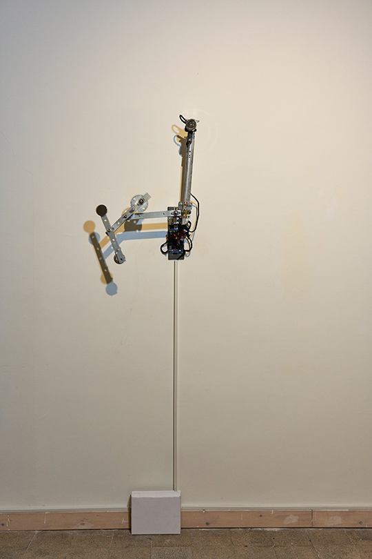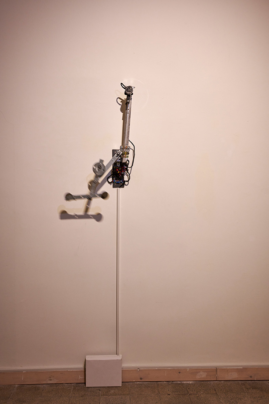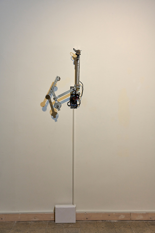 A kinetic installation consisting of a metal triple pendulum, a motorized arm, and an electromagnet. The triple pendulum is a deterministic system operating according to fixed physical laws, yet it is practically unpredictable due to its extreme sensitivity to initial conditions (the "butterfly effect"). The piece demonstrates a cyclic cycle of existence: the resting state represents "death" or thermodynamic equilibrium, while the motorized arm and electromagnet act as "external agents" injecting vital energy and information back into the system, thereby forcing it back into a state of instability and drama.