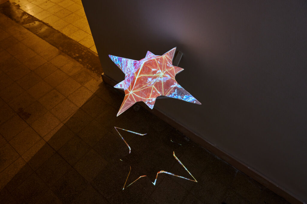A video-mapping installation based on a geometric model of a Triakis Tetrahedron. The process began with digital processing of the form to increase its surface area, unfolding it into a 2D diagram, and manually assembling it from cardboard cuts. The object was coated with a thin layer of plaster, giving it a crystalline and uniform appearance that serves as a "screen" for a generative projection precisely calibrated to it. The projected content is created in real-time and includes scenes of SDF bodies merging into the structure, particle streams moving between facets, and light lines (Line Saber) following the form's contour.