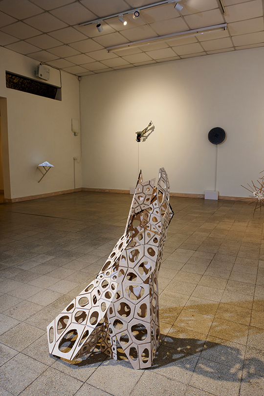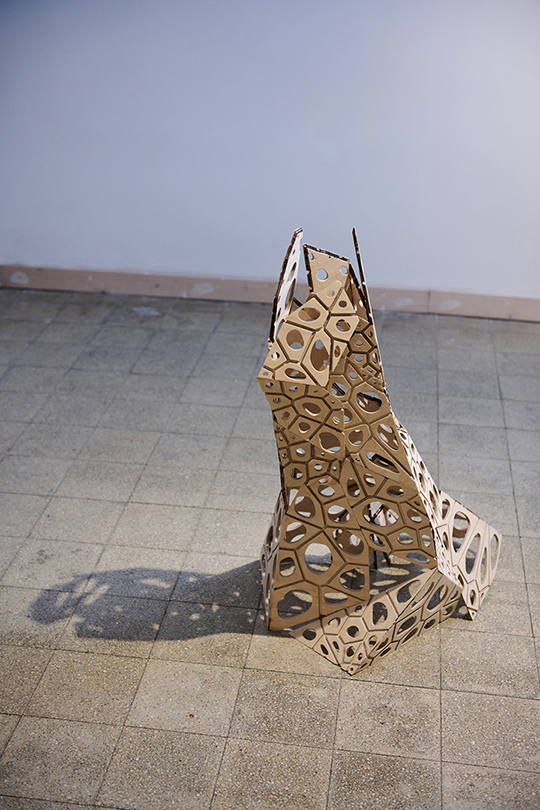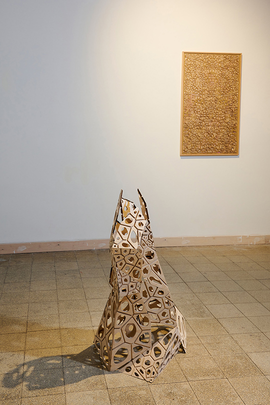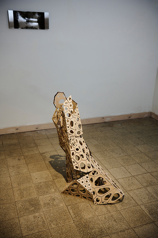 A CNC wood-cutting piece executed in milling at varying depth levels. The work is based on the "Worley Noise" algorithm in Manhattan metric—a mathematical variation that creates rigid geometric patterns with sharp angles. The combination of different depth layers and the geometric subdivision of the surface produce a complex structure reminiscent of a multi-dimensional maze or futuristic infrastructure maps.