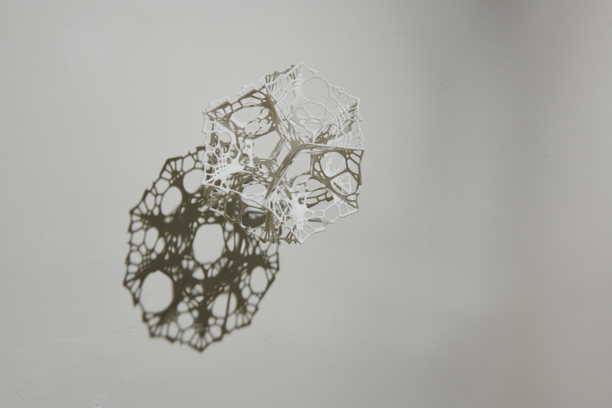 A 3D print of a dodecahedron (a Platonic solid) that has undergone a process of internal hollowing and subtraction. The massive facets were converted into a complex system of networks created using an algorithm based on the formulas of architect and engineer Frei Otto. The result is a radical reduction of the full form into an airy skeleton, reminiscent of an organic skeletal structure.