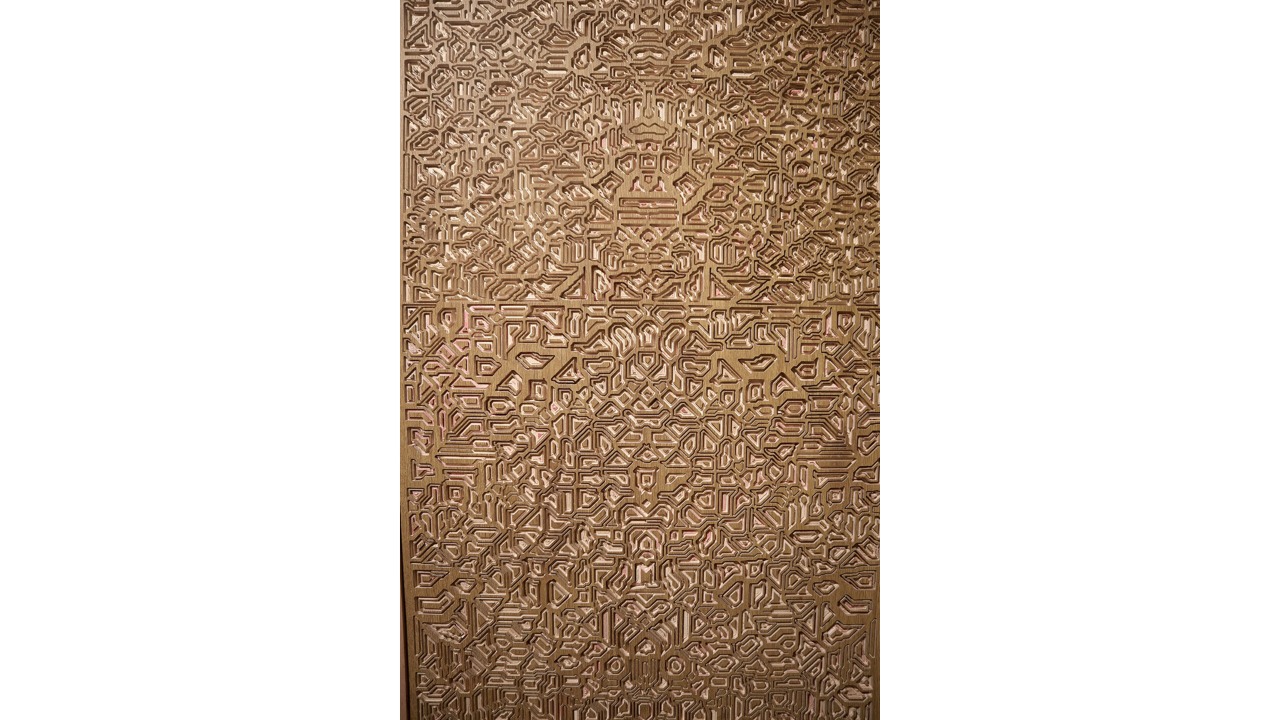 A CNC wood-cutting piece executed in milling at varying depth levels. The work is based on the "Worley Noise" algorithm in Manhattan metric—a mathematical variation that creates rigid geometric patterns with sharp angles. The combination of different depth layers and the geometric subdivision of the surface produce a complex structure reminiscent of a multi-dimensional maze or futuristic infrastructure maps.