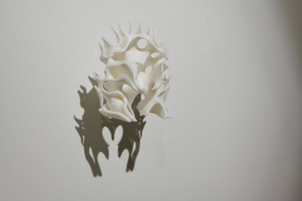 A 3D-printed sculptural object created through a process of subtraction. The original form was processed using a "Gyroid" algorithm—a complex geometric structure composed entirely of curves without straight lines. The final piece retains a contour reminiscent of a human figure or a living entity, but it is perforated and open, with a bio-organic appearance resembling coral or microscopic skeletal structures.